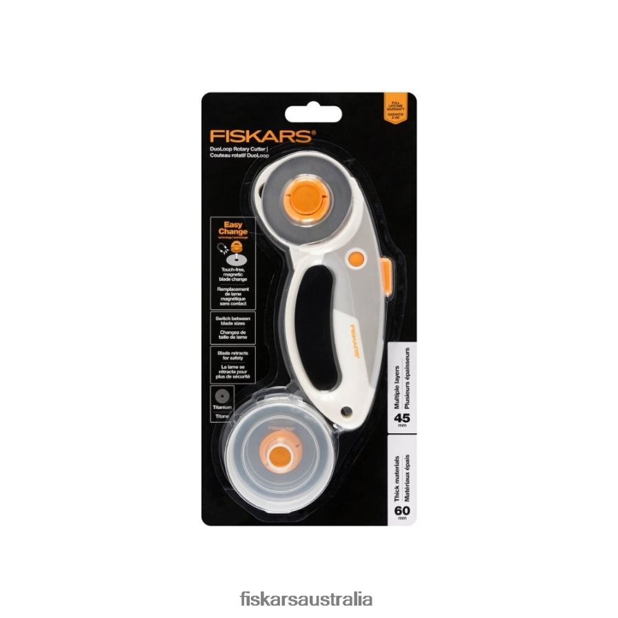 - Fiskars Easy Change DuoLoop Rotary Cutter is a space-saving 2-in-1 tool that can easily alternate between 45 mm and 60 mm blades